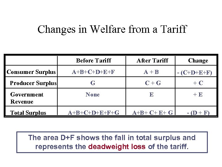 Changes in Welfare from a Tariff Before Tariff After Tariff A+B+C+D+E+F A+B G C+G +C Government Revenue None E +E Total Surplus A+B+C+D+E+F+G A+B+ C+ E+ G - (D + F) Consumer Surplus Producer Surplus Change - (C+D+E+F) The area D+F shows the fall in total surplus and represents the deadweight loss of the tariff.