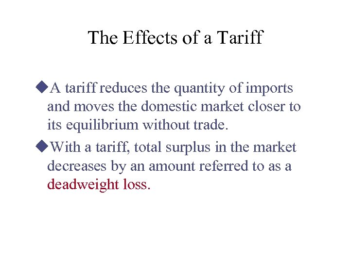 The Effects of a Tariff u. A tariff reduces the quantity of imports and moves the domestic market closer to its equilibrium without trade. u. With a tariff, total surplus in the market decreases by an amount referred to as a deadweight loss.