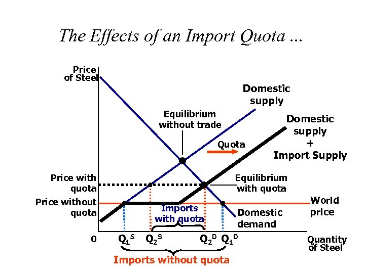 The Effects of an Import Quota. . . Price of Steel Domestic supply Equilibrium without trade Quota Price with quota Price without quota 0 Domestic supply + Import Supply Equilibrium with quota Imports with quota Q 1 S Q 2 S Domestic demand Q 2 D Q 1 D Imports without quota World price Quantity of Steel