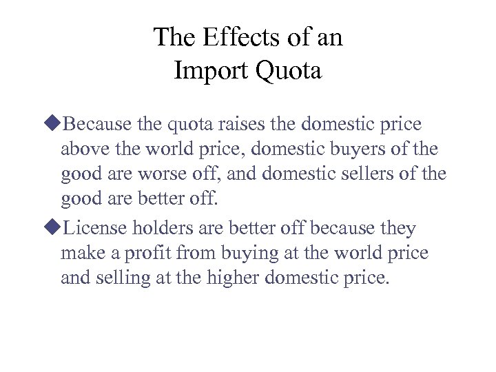 The Effects of an Import Quota u. Because the quota raises the domestic price above the world price, domestic buyers of the good are worse off, and domestic sellers of the good are better off. u. License holders are better off because they make a profit from buying at the world price and selling at the higher domestic price.