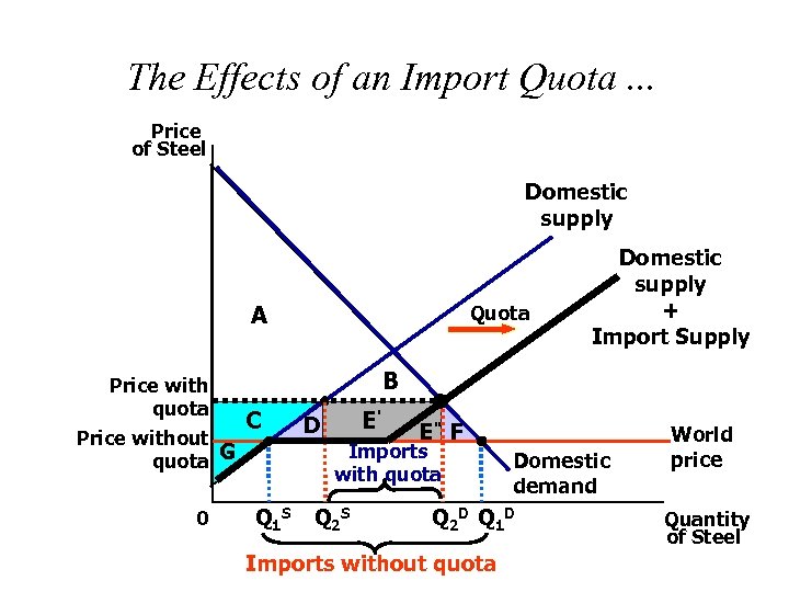 The Effects of an Import Quota. . . Price of Steel Domestic supply A Price with quota Price without quota G 0 Quota Domestic supply + Import Supply B C Q 1 S D E' E'' F Imports with quota Q 2 S Domestic demand Q 2 D Q 1 D Imports without quota World price Quantity of Steel