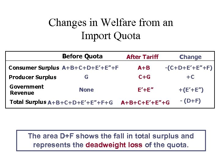 Changes in Welfare from an Import Quota Before Quota Consumer Surplus A+B+C+D+E’+E”+F Producer Surplus Government Revenue After Tariff Change A+B -(C+D+E’+E”+F) G C+G +C None E’+E” +(E’+E”) A+B+C+E’+E”+G - (D+F) Total Surplus A+B+C+D+E’+E”+F+G The area D+F shows the fall in total surplus and represents the deadweight loss of the quota.
