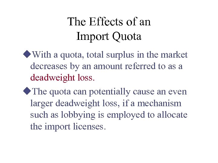 The Effects of an Import Quota u. With a quota, total surplus in the market decreases by an amount referred to as a deadweight loss. u. The quota can potentially cause an even larger deadweight loss, if a mechanism such as lobbying is employed to allocate the import licenses.