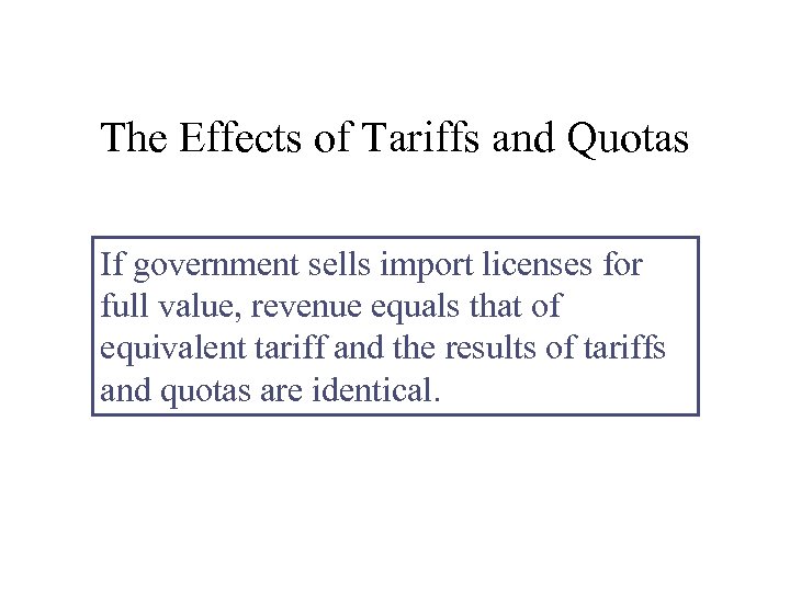 The Effects of Tariffs and Quotas If government sells import licenses for full value, revenue equals that of equivalent tariff and the results of tariffs and quotas are identical.