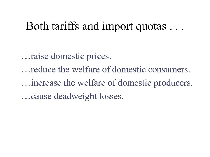 Both tariffs and import quotas. . . ¼raise domestic prices. ¼reduce the welfare of domestic consumers. ¼increase the welfare of domestic producers. ¼cause deadweight losses.
