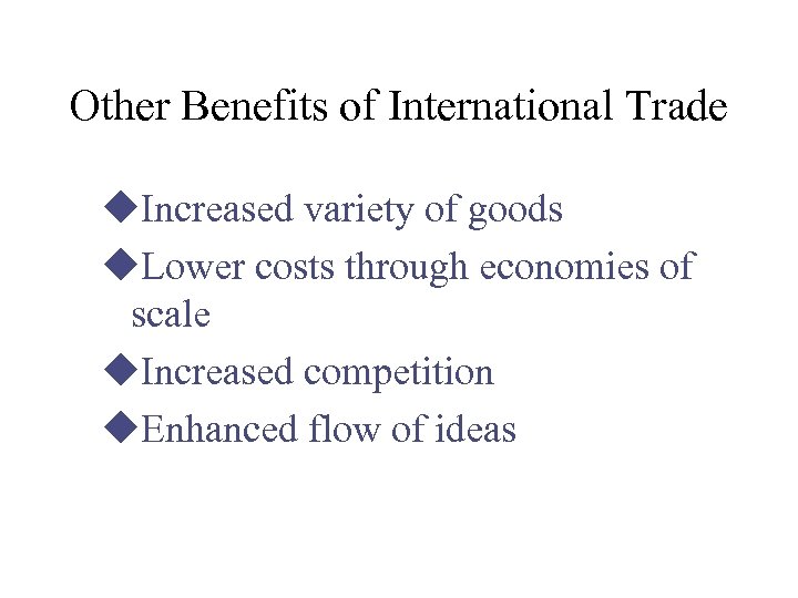 Other Benefits of International Trade u. Increased variety of goods u. Lower costs through economies of scale u. Increased competition u. Enhanced flow of ideas