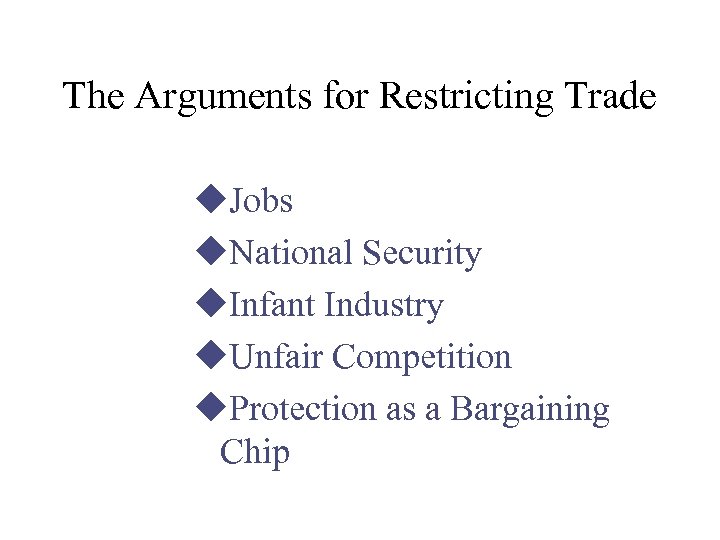 The Arguments for Restricting Trade u. Jobs u. National Security u. Infant Industry u. Unfair Competition u. Protection as a Bargaining Chip