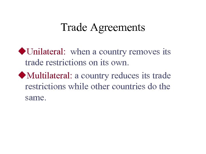 Trade Agreements u. Unilateral: when a country removes its trade restrictions on its own. u. Multilateral: a country reduces its trade restrictions while other countries do the same.