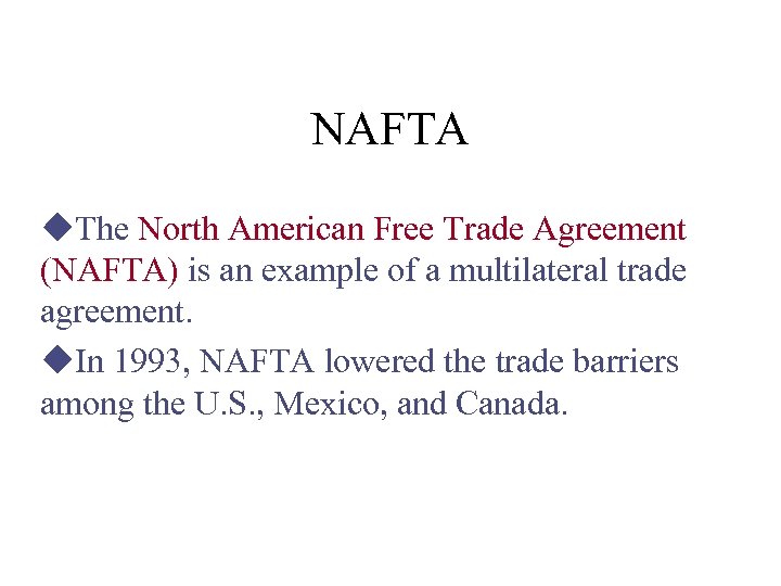 NAFTA u. The North American Free Trade Agreement (NAFTA) is an example of a multilateral trade agreement. u. In 1993, NAFTA lowered the trade barriers among the U. S. , Mexico, and Canada.