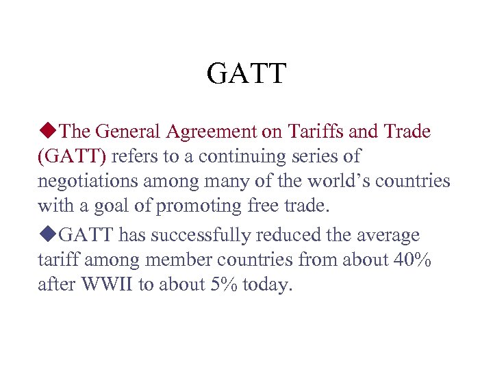 GATT u. The General Agreement on Tariffs and Trade (GATT) refers to a continuing series of negotiations among many of the world’s countries with a goal of promoting free trade. u. GATT has successfully reduced the average tariff among member countries from about 40% after WWII to about 5% today.