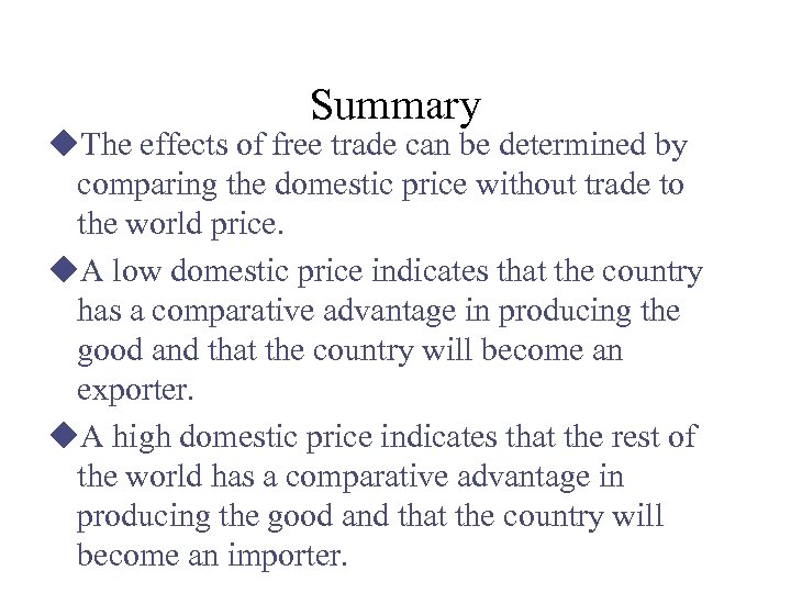 Summary u. The effects of free trade can be determined by comparing the domestic price without trade to the world price. u. A low domestic price indicates that the country has a comparative advantage in producing the good and that the country will become an exporter. u. A high domestic price indicates that the rest of the world has a comparative advantage in producing the good and that the country will become an importer.