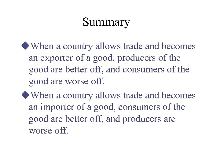Summary u. When a country allows trade and becomes an exporter of a good, producers of the good are better off, and consumers of the good are worse off. u. When a country allows trade and becomes an importer of a good, consumers of the good are better off, and producers are worse off.