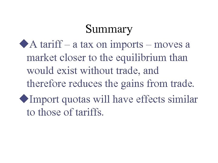 Summary u. A tariff – a tax on imports – moves a market closer to the equilibrium than would exist without trade, and therefore reduces the gains from trade. u. Import quotas will have effects similar to those of tariffs.