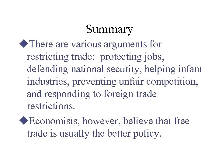 Summary u. There are various arguments for restricting trade: protecting jobs, defending national security, helping infant industries, preventing unfair competition, and responding to foreign trade restrictions. u. Economists, however, believe that free trade is usually the better policy.