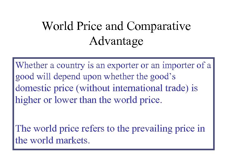 World Price and Comparative Advantage Whether a country is an exporter or an importer of a good will depend upon whether the good’s domestic price (without international trade) is higher or lower than the world price. The world price refers to the prevailing price in the world markets.