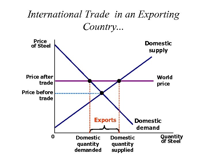 International Trade in an Exporting Country. . . Price of Steel Domestic supply Price after trade World price Price before trade Exports 0 Domestic quantity demanded Domestic demand Domestic quantity supplied Quantity of Steel