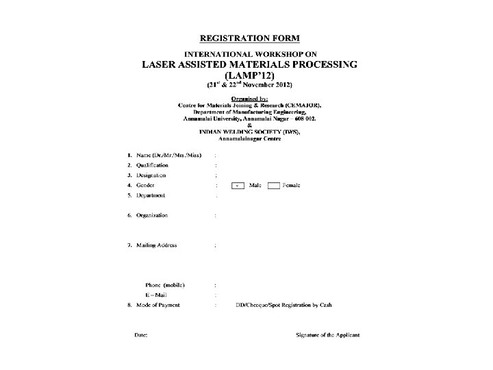 Venue: Golden Jubilee Reunion (GJR) Hall, Faculty of Engineering & Technology, Annamalai University, Chidmabaram* *Chidambaram is well connected by Train & Road. It is 225 km south of Chennai and 160 km north of Tiruchirappalli. Registration Fee: q Participants from Industry/Academic Institutions……Rs. 2000 q Full time Research Scholars/PG/UG Students…………. Rs. 1000 For Further details, Please contact: Dr. S. RAJAKUMAR, Organizing Secretary, Centre for Materials Joining & Research (CEMAJOR), Department of Manufacturing Engineering, ANNAMALAI UNIVERSITY, Annamalainagar – 608 002. Email: srkcemajor@yahoo. com Mobile: 09486870051