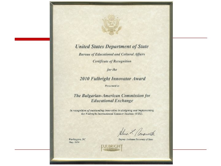 The Fulbright Program in Bulgaria o Administered by the Bulgarian-American Commission of Educational Exchange established in 1993 by a bilateral agreement between the governments of the US and the Republic of Bulgaria; o Programs in Bulgaria: core student and scholar program; senior specialist program; ETA program; Fulbright-Hays Summer seminars; Hubert Humphrey fellowship; New Century Scholars; Science and Technology Award; Fulbright-Oklahoma MBA scholarship; Fulbright-Thanks to Scandinavia scholarship; Fulbright -CEE Trust research award; o Supplemental activities: advising and outreach; language training, paper-based and computer-based testing (SAT, GMAT, GRE, LSAT, CFA, EPSO etc); biennial conferences, seminars, workshops; binational and regional projects; FISI; o Fulbright alumni by 2010: 907 ( 479 Bulgarians and 428 Americans).