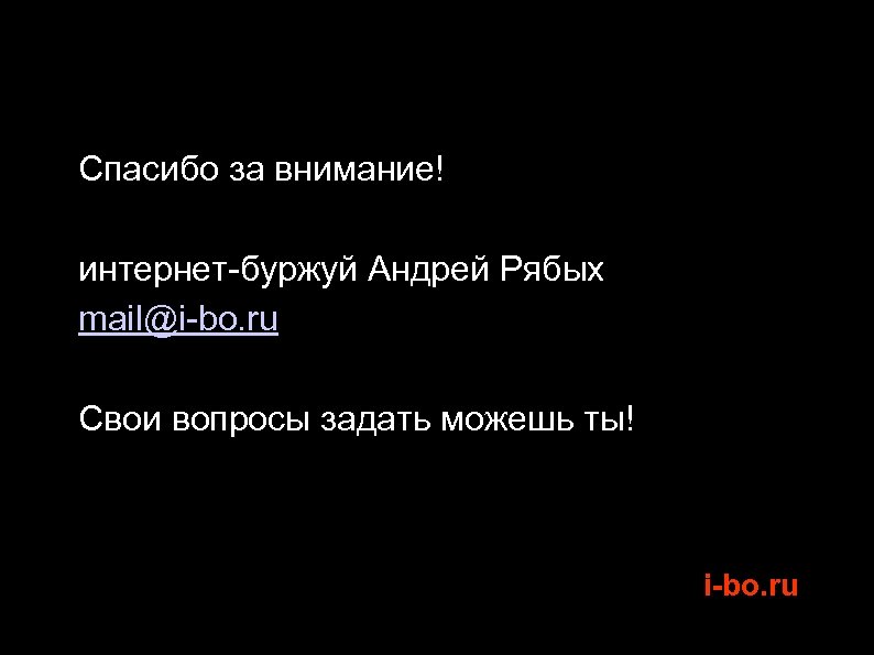 Спасибо за внимание! интернет-буржуй Андрей Рябых mail@i-bo. ru Свои вопросы задать можешь ты! i-bo. ru
