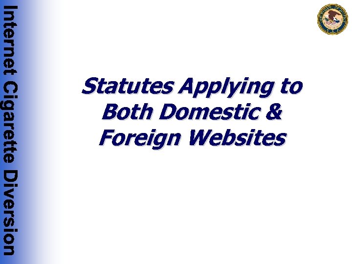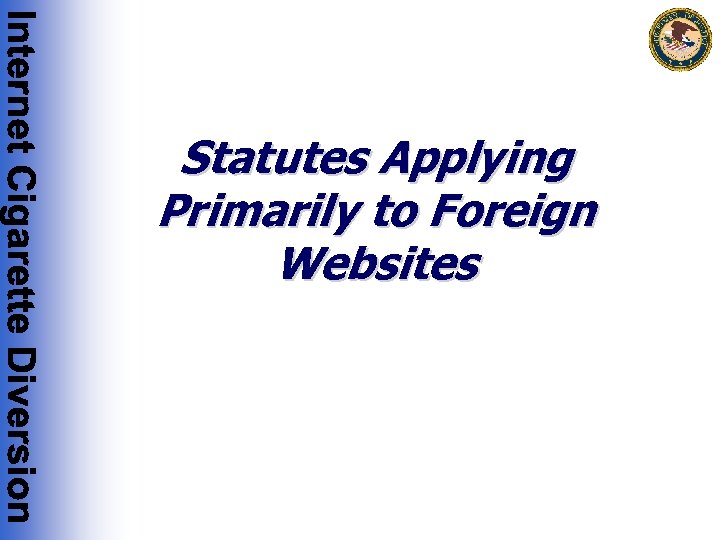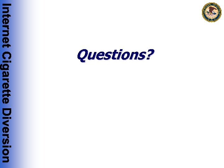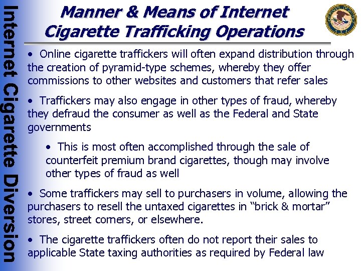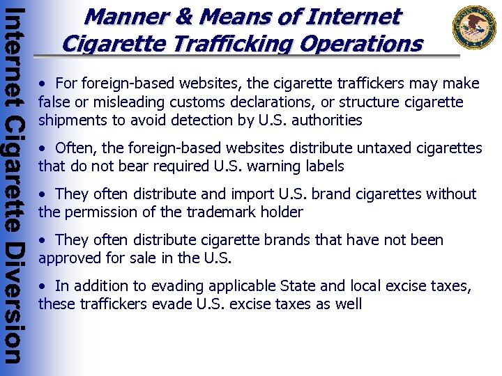 Manner & Means of Internet Cigarette Trafficking Operations • For foreign-based websites, the cigarette traffickers may make false or misleading customs declarations, or structure cigarette shipments to avoid detection by U. S. authorities • Often, the foreign-based websites distribute untaxed cigarettes that do not bear required U. S. warning labels • They often distribute and import U. S. brand cigarettes without the permission of the trademark holder • They often distribute cigarette brands that have not been approved for sale in the U. S. • In addition to evading applicable State and local excise taxes, these traffickers evade U. S. excise taxes as well