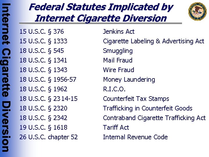 Federal Statutes Implicated by Internet Cigarette Diversion 15 U. S. C. § 376 Jenkins Act 15 U. S. C. § 1333 Cigarette Labeling & Advertising Act 18 18 19 26 Smuggling Mail Fraud Wire Fraud Money Laundering R. I. C. O. Counterfeit Tax Stamps Trafficking in Counterfeit Goods Contraband Cigarette Trafficking Act Tariff Act Internal Revenue Code U. S. C. § 545 § 1341 § 1343 § 1956 -57 § 1962 § 23 14 -15 § 2320 § 2342 § 1618 chapter 52