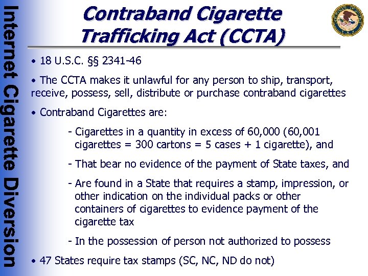 Contraband Cigarette Trafficking Act (CCTA) • 18 U. S. C. §§ 2341 -46 • The CCTA makes it unlawful for any person to ship, transport, receive, possess, sell, distribute or purchase contraband cigarettes • Contraband Cigarettes are: - Cigarettes in a quantity in excess of 60, 000 (60, 001 cigarettes = 300 cartons = 5 cases + 1 cigarette), and - That bear no evidence of the payment of State taxes, and - Are found in a State that requires a stamp, impression, or other indication on the individual packs or other containers of cigarettes to evidence payment of the cigarette tax - In the possession of person not authorized to possess • 47 States require tax stamps (SC, ND do not)