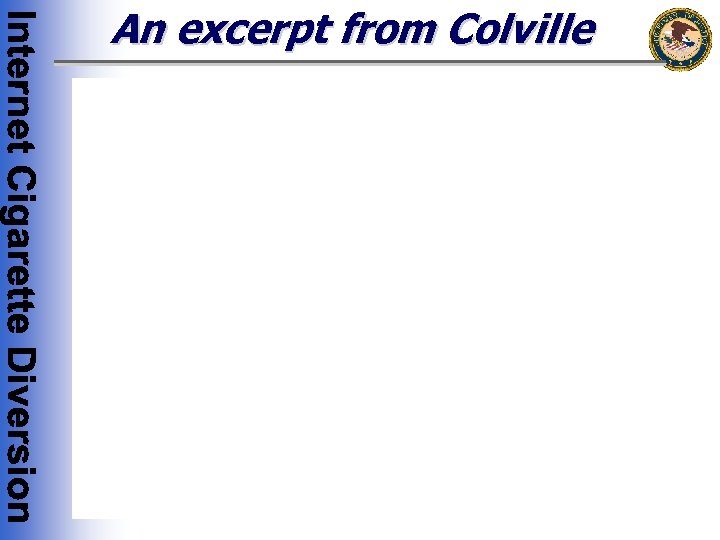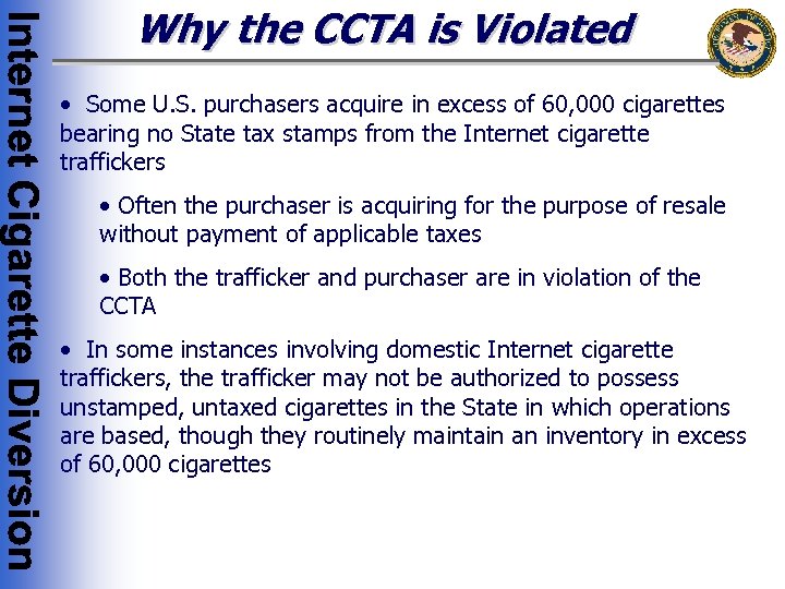 Why the CCTA is Violated • Some U. S. purchasers acquire in excess of 60, 000 cigarettes bearing no State tax stamps from the Internet cigarette traffickers • Often the purchaser is acquiring for the purpose of resale without payment of applicable taxes • Both the trafficker and purchaser are in violation of the CCTA • In some instances involving domestic Internet cigarette traffickers, the trafficker may not be authorized to possess unstamped, untaxed cigarettes in the State in which operations are based, though they routinely maintain an inventory in excess of 60, 000 cigarettes