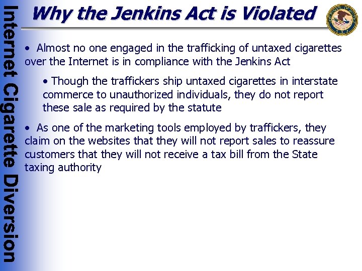 Why the Jenkins Act is Violated • Almost no one engaged in the trafficking of untaxed cigarettes over the Internet is in compliance with the Jenkins Act • Though the traffickers ship untaxed cigarettes in interstate commerce to unauthorized individuals, they do not report these sale as required by the statute • As one of the marketing tools employed by traffickers, they claim on the websites that they will not report sales to reassure customers that they will not receive a tax bill from the State taxing authority