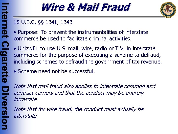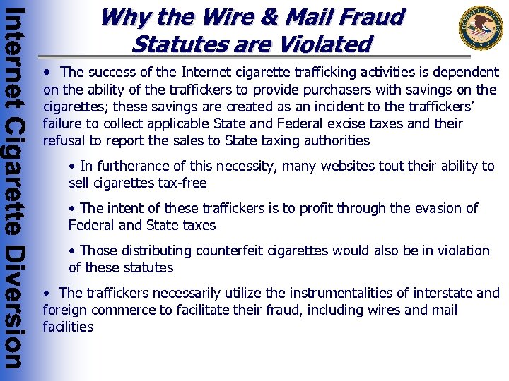 Why the Wire & Mail Fraud Statutes are Violated • The success of the Internet cigarette trafficking activities is dependent on the ability of the traffickers to provide purchasers with savings on the cigarettes; these savings are created as an incident to the traffickers’ failure to collect applicable State and Federal excise taxes and their refusal to report the sales to State taxing authorities • In furtherance of this necessity, many websites tout their ability to sell cigarettes tax-free • The intent of these traffickers is to profit through the evasion of Federal and State taxes • Those distributing counterfeit cigarettes would also be in violation of these statutes • The traffickers necessarily utilize the instrumentalities of interstate and foreign commerce to facilitate their fraud, including wires and mail facilities