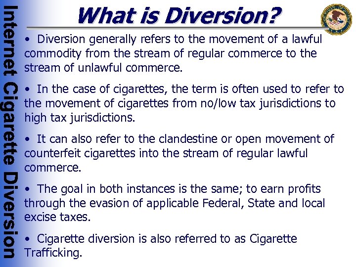 What is Diversion? • Diversion generally refers to the movement of a lawful commodity from the stream of regular commerce to the stream of unlawful commerce. • In the case of cigarettes, the term is often used to refer to the movement of cigarettes from no/low tax jurisdictions to high tax jurisdictions. • It can also refer to the clandestine or open movement of counterfeit cigarettes into the stream of regular lawful commerce. • The goal in both instances is the same; to earn profits through the evasion of applicable Federal, State and local excise taxes. • Cigarette diversion is also referred to as Cigarette Trafficking.