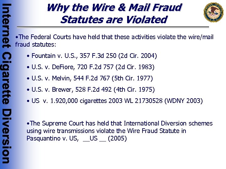 Why the Wire & Mail Fraud Statutes are Violated • The Federal Courts have held that these activities violate the wire/mail fraud statutes: • Fountain v. U. S. , 357 F. 3 d 250 (2 d Cir. 2004) • U. S. v. De. Fiore, 720 F. 2 d 757 (2 d Cir. 1983) • U. S. v. Melvin, 544 F. 2 d 767 (5 th Cir. 1977) • U. S. v. Brewer, 528 F. 2 d 492 (4 th Cir. 1975) • US v. 1. 920, 000 cigarettes 2003 WL 21730528 (WDNY 2003) • The Supreme Court has held that International Diversion schemes using wire transmissions violate the Wire Fraud Statute in Pasquantino v. US, __US __ (2005)