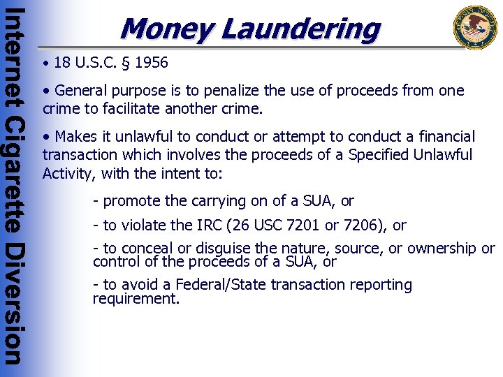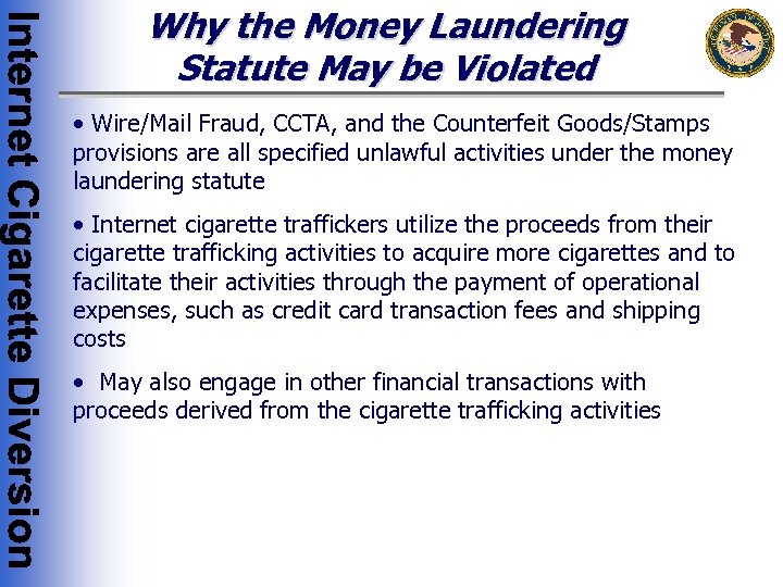Why the Money Laundering Statute May be Violated • Wire/Mail Fraud, CCTA, and the Counterfeit Goods/Stamps provisions are all specified unlawful activities under the money laundering statute • Internet cigarette traffickers utilize the proceeds from their cigarette trafficking activities to acquire more cigarettes and to facilitate their activities through the payment of operational expenses, such as credit card transaction fees and shipping costs • May also engage in other financial transactions with proceeds derived from the cigarette trafficking activities