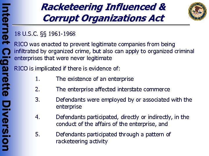 Racketeering Influenced & Corrupt Organizations Act 18 U. S. C. §§ 1961 -1968 RICO was enacted to prevent legitimate companies from being infiltrated by organized crime, but also can apply to organized criminal enterprises that were never legitimate RICO is implicated if there is evidence of: 1. The existence of an enterprise 2. The enterprise affected interstate commerce 3. Defendants were employed by or associated with the enterprise 4. Defendants participated, directly or indirectly, in the conduct of the affairs of the enterprise, and 5. Defendants participated through a pattern of racketeering activity