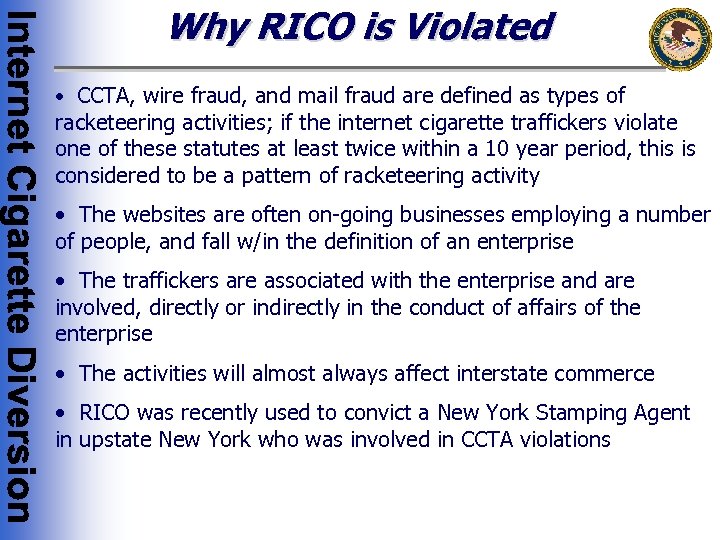 Why RICO is Violated • CCTA, wire fraud, and mail fraud are defined as types of racketeering activities; if the internet cigarette traffickers violate one of these statutes at least twice within a 10 year period, this is considered to be a pattern of racketeering activity • The websites are often on-going businesses employing a number of people, and fall w/in the definition of an enterprise • The traffickers are associated with the enterprise and are involved, directly or indirectly in the conduct of affairs of the enterprise • The activities will almost always affect interstate commerce • RICO was recently used to convict a New York Stamping Agent in upstate New York who was involved in CCTA violations