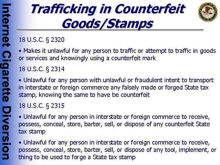 Trafficking in Counterfeit Goods/Stamps 18 U. S. C. § 2320 • Makes it unlawful for any person to traffic or attempt to traffic in goods or services and knowingly using a counterfeit mark 18 U. S. C. § 2314 • Unlawful for any person with unlawful or fraudulent intent to transport in interstate or foreign commerce any falsely made or forged State tax stamp, knowing the same to have be counterfeit 18 U. S. C. § 2315 • Unlawful for any person in interstate or foreign commerce to receive, possess, conceal, store, barter, sell, or dispose of any counterfeit State tax stamp • Unlawful for any person in interstate or foreign commerce to receive, possess, conceal, store, barter, sell, or dispose of any tool, implement, or thing to be used to forge a State tax stamp