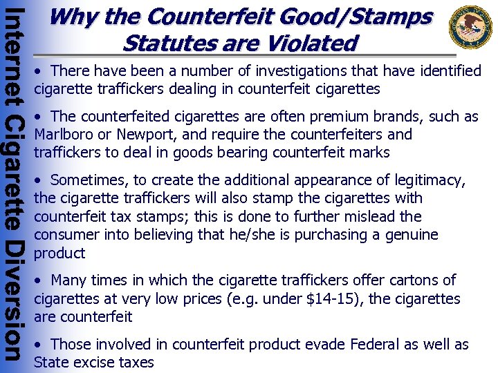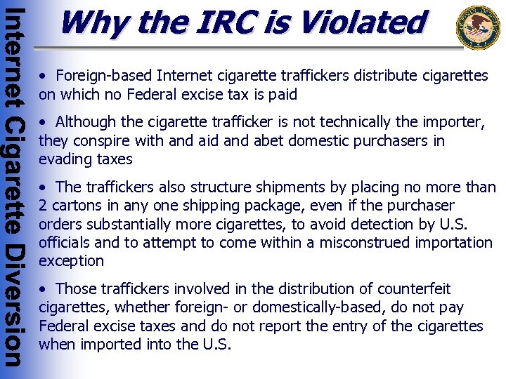 Why the IRC is Violated • Foreign-based Internet cigarette traffickers distribute cigarettes on which no Federal excise tax is paid • Although the cigarette trafficker is not technically the importer, they conspire with and aid and abet domestic purchasers in evading taxes • The traffickers also structure shipments by placing no more than 2 cartons in any one shipping package, even if the purchaser orders substantially more cigarettes, to avoid detection by U. S. officials and to attempt to come within a misconstrued importation exception • Those traffickers involved in the distribution of counterfeit cigarettes, whether foreign- or domestically-based, do not pay Federal excise taxes and do not report the entry of the cigarettes when imported into the U. S.