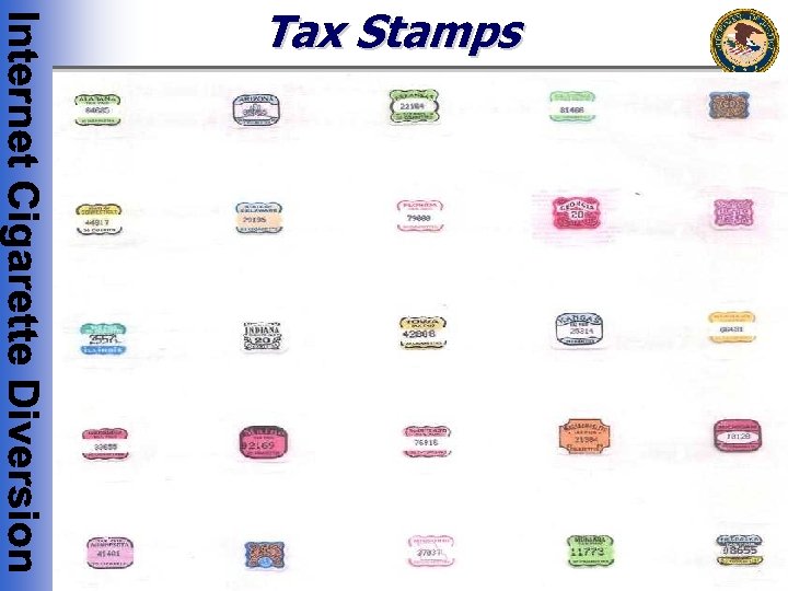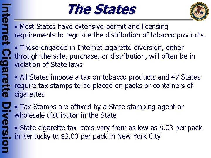 The States • Most States have extensive permit and licensing requirements to regulate the distribution of tobacco products. • Those engaged in Internet cigarette diversion, either through the sale, purchase, or distribution, will often be in violation of State laws • All States impose a tax on tobacco products and 47 States require tax stamps to be placed on packs or containers of cigarettes • Tax Stamps are affixed by a State stamping agent or wholesale distributor in the State • State cigarette tax rates vary from as low as $. 03 per pack in Kentucky to $3. 00 per pack in New York City