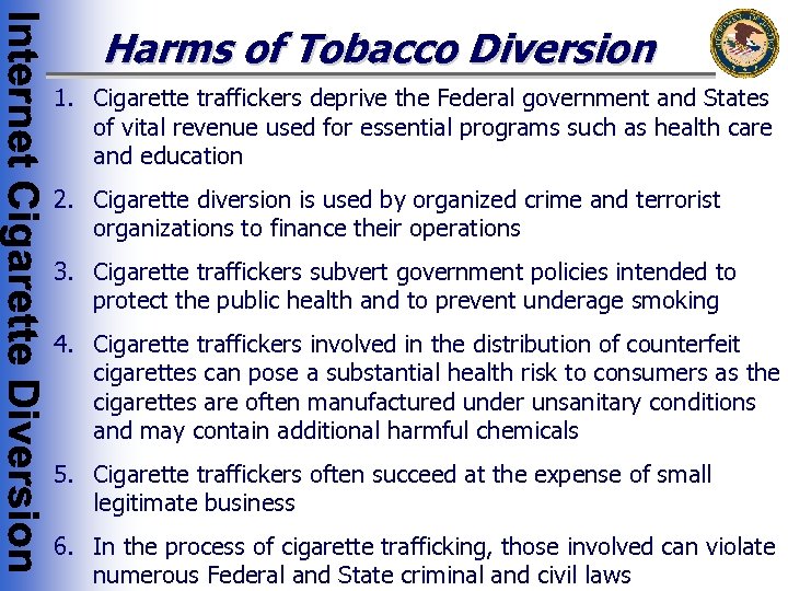 Harms of Tobacco Diversion 1. Cigarette traffickers deprive the Federal government and States of vital revenue used for essential programs such as health care and education 2. Cigarette diversion is used by organized crime and terrorist organizations to finance their operations 3. Cigarette traffickers subvert government policies intended to protect the public health and to prevent underage smoking 4. Cigarette traffickers involved in the distribution of counterfeit cigarettes can pose a substantial health risk to consumers as the cigarettes are often manufactured under unsanitary conditions and may contain additional harmful chemicals 5. Cigarette traffickers often succeed at the expense of small legitimate business 6. In the process of cigarette trafficking, those involved can violate numerous Federal and State criminal and civil laws