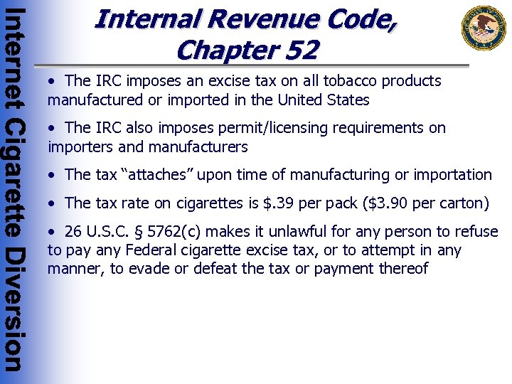 Internal Revenue Code, Chapter 52 • The IRC imposes an excise tax on all tobacco products manufactured or imported in the United States • The IRC also imposes permit/licensing requirements on importers and manufacturers • The tax “attaches” upon time of manufacturing or importation • The tax rate on cigarettes is $. 39 per pack ($3. 90 per carton) • 26 U. S. C. § 5762(c) makes it unlawful for any person to refuse to pay any Federal cigarette excise tax, or to attempt in any manner, to evade or defeat the tax or payment thereof