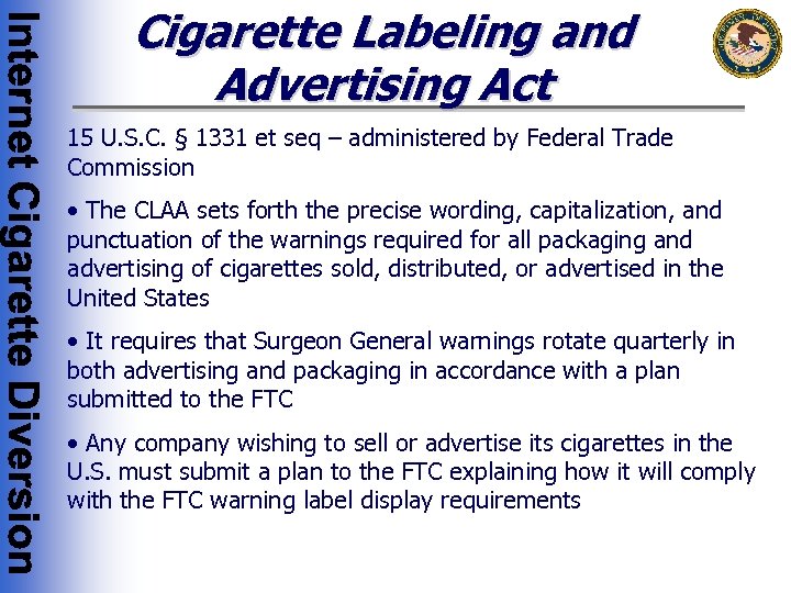 Cigarette Labeling and Advertising Act 15 U. S. C. § 1331 et seq – administered by Federal Trade Commission • The CLAA sets forth the precise wording, capitalization, and punctuation of the warnings required for all packaging and advertising of cigarettes sold, distributed, or advertised in the United States • It requires that Surgeon General warnings rotate quarterly in both advertising and packaging in accordance with a plan submitted to the FTC • Any company wishing to sell or advertise its cigarettes in the U. S. must submit a plan to the FTC explaining how it will comply with the FTC warning label display requirements