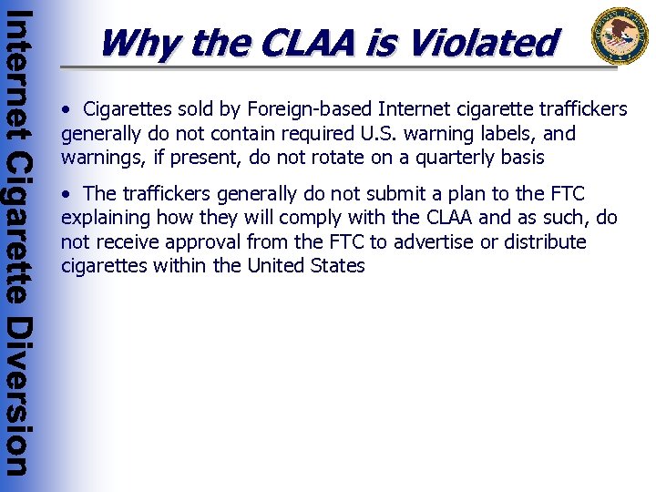 Why the CLAA is Violated • Cigarettes sold by Foreign-based Internet cigarette traffickers generally do not contain required U. S. warning labels, and warnings, if present, do not rotate on a quarterly basis • The traffickers generally do not submit a plan to the FTC explaining how they will comply with the CLAA and as such, do not receive approval from the FTC to advertise or distribute cigarettes within the United States