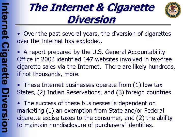 The Internet & Cigarette Diversion • Over the past several years, the diversion of cigarettes over the Internet has exploded. • A report prepared by the U. S. General Accountability Office in 2003 identified 147 websites involved in tax-free cigarette sales via the Internet. There are likely hundreds, if not thousands, more. • These Internet businesses operate from (1) low tax States, (2) Indian Reservations, and (3) foreign countries. • The success of these businesses is dependent on marketing (1) an exemption from State and/or Federal cigarette excise taxes to the consumer, and (2) the ability to maintain nondisclosure of purchasers’ identities.