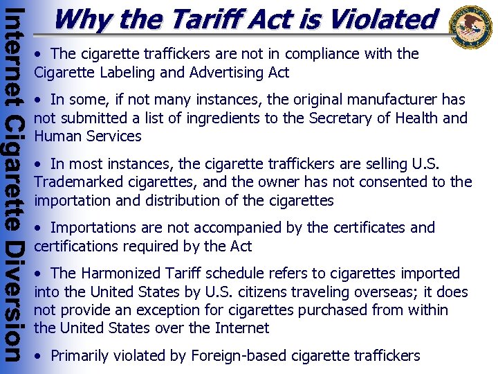 Why the Tariff Act is Violated • The cigarette traffickers are not in compliance with the Cigarette Labeling and Advertising Act • In some, if not many instances, the original manufacturer has not submitted a list of ingredients to the Secretary of Health and Human Services • In most instances, the cigarette traffickers are selling U. S. Trademarked cigarettes, and the owner has not consented to the importation and distribution of the cigarettes • Importations are not accompanied by the certificates and certifications required by the Act • The Harmonized Tariff schedule refers to cigarettes imported into the United States by U. S. citizens traveling overseas; it does not provide an exception for cigarettes purchased from within the United States over the Internet • Primarily violated by Foreign-based cigarette traffickers