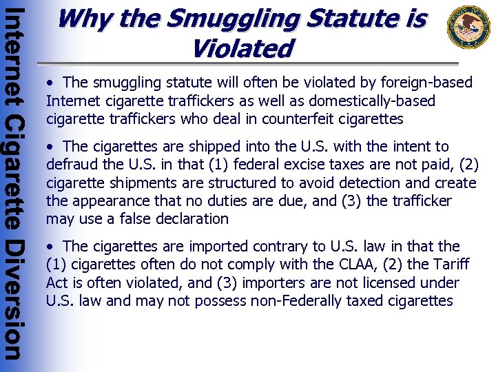Why the Smuggling Statute is Violated • The smuggling statute will often be violated by foreign-based Internet cigarette traffickers as well as domestically-based cigarette traffickers who deal in counterfeit cigarettes • The cigarettes are shipped into the U. S. with the intent to defraud the U. S. in that (1) federal excise taxes are not paid, (2) cigarette shipments are structured to avoid detection and create the appearance that no duties are due, and (3) the trafficker may use a false declaration • The cigarettes are imported contrary to U. S. law in that the (1) cigarettes often do not comply with the CLAA, (2) the Tariff Act is often violated, and (3) importers are not licensed under U. S. law and may not possess non-Federally taxed cigarettes