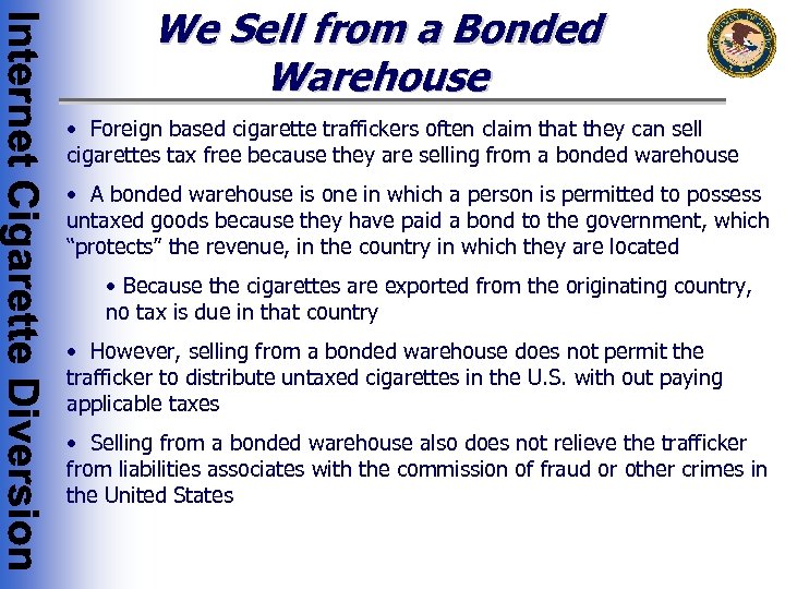We Sell from a Bonded Warehouse • Foreign based cigarette traffickers often claim that they can sell cigarettes tax free because they are selling from a bonded warehouse • A bonded warehouse is one in which a person is permitted to possess untaxed goods because they have paid a bond to the government, which “protects” the revenue, in the country in which they are located • Because the cigarettes are exported from the originating country, no tax is due in that country • However, selling from a bonded warehouse does not permit the trafficker to distribute untaxed cigarettes in the U. S. with out paying applicable taxes • Selling from a bonded warehouse also does not relieve the trafficker from liabilities associates with the commission of fraud or other crimes in the United States