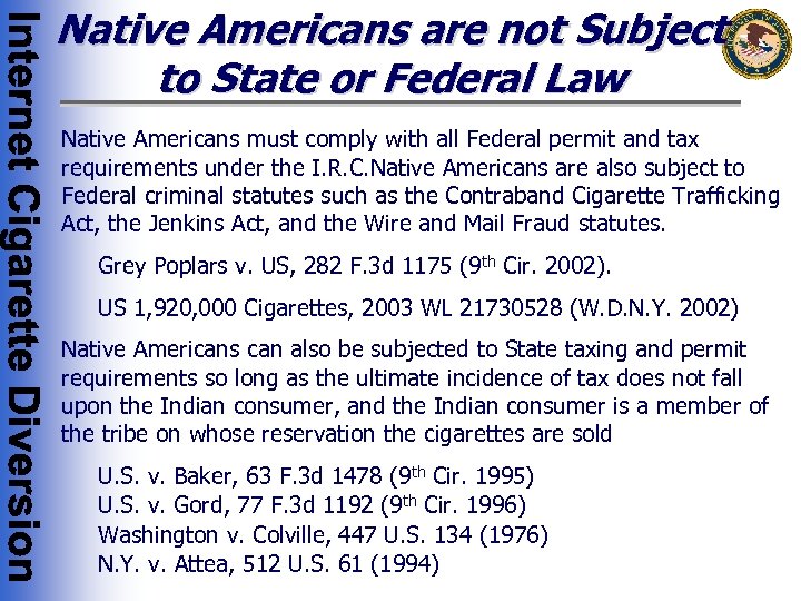 Native Americans are not Subject to State or Federal Law Native Americans must comply with all Federal permit and tax requirements under the I. R. C. Native Americans are also subject to Federal criminal statutes such as the Contraband Cigarette Trafficking Act, the Jenkins Act, and the Wire and Mail Fraud statutes. Grey Poplars v. US, 282 F. 3 d 1175 (9 th Cir. 2002). US 1, 920, 000 Cigarettes, 2003 WL 21730528 (W. D. N. Y. 2002) Native Americans can also be subjected to State taxing and permit requirements so long as the ultimate incidence of tax does not fall upon the Indian consumer, and the Indian consumer is a member of the tribe on whose reservation the cigarettes are sold U. S. v. Baker, 63 F. 3 d 1478 (9 th Cir. 1995) U. S. v. Gord, 77 F. 3 d 1192 (9 th Cir. 1996) Washington v. Colville, 447 U. S. 134 (1976) N. Y. v. Attea, 512 U. S. 61 (1994)