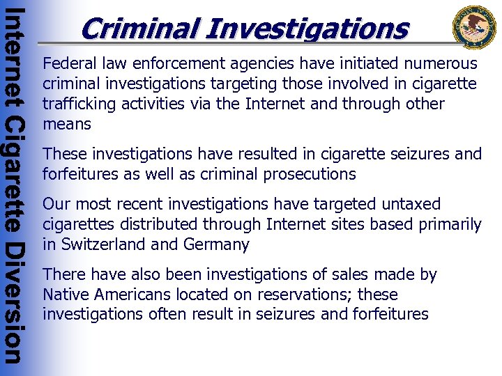 Criminal Investigations Federal law enforcement agencies have initiated numerous criminal investigations targeting those involved in cigarette trafficking activities via the Internet and through other means These investigations have resulted in cigarette seizures and forfeitures as well as criminal prosecutions Our most recent investigations have targeted untaxed cigarettes distributed through Internet sites based primarily in Switzerland Germany There have also been investigations of sales made by Native Americans located on reservations; these investigations often result in seizures and forfeitures
