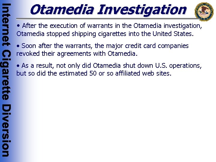 Otamedia Investigation • After the execution of warrants in the Otamedia investigation, Otamedia stopped shipping cigarettes into the United States. • Soon after the warrants, the major credit card companies revoked their agreements with Otamedia. • As a result, not only did Otamedia shut down U. S. operations, but so did the estimated 50 or so affiliated web sites.