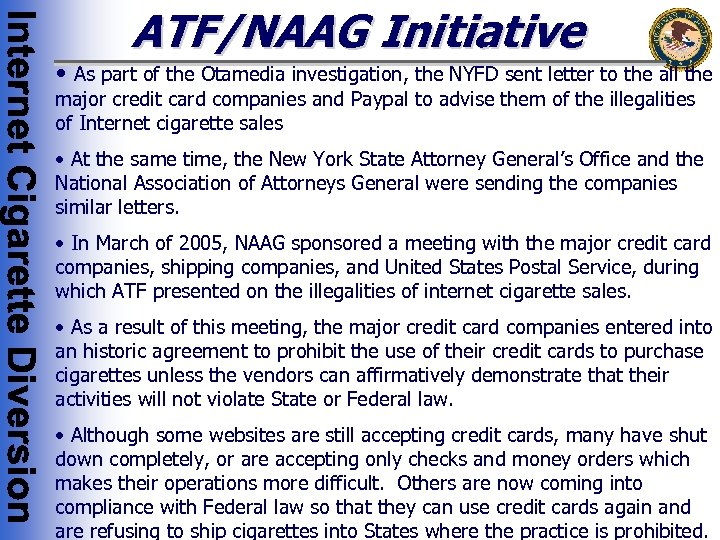 ATF/NAAG Initiative • As part of the Otamedia investigation, the NYFD sent letter to the all the major credit card companies and Paypal to advise them of the illegalities of Internet cigarette sales • At the same time, the New York State Attorney General’s Office and the National Association of Attorneys General were sending the companies similar letters. • In March of 2005, NAAG sponsored a meeting with the major credit card companies, shipping companies, and United States Postal Service, during which ATF presented on the illegalities of internet cigarette sales. • As a result of this meeting, the major credit card companies entered into an historic agreement to prohibit the use of their credit cards to purchase cigarettes unless the vendors can affirmatively demonstrate that their activities will not violate State or Federal law. • Although some websites are still accepting credit cards, many have shut down completely, or are accepting only checks and money orders which makes their operations more difficult. Others are now coming into compliance with Federal law so that they can use credit cards again and are refusing to ship cigarettes into States where the practice is prohibited.
