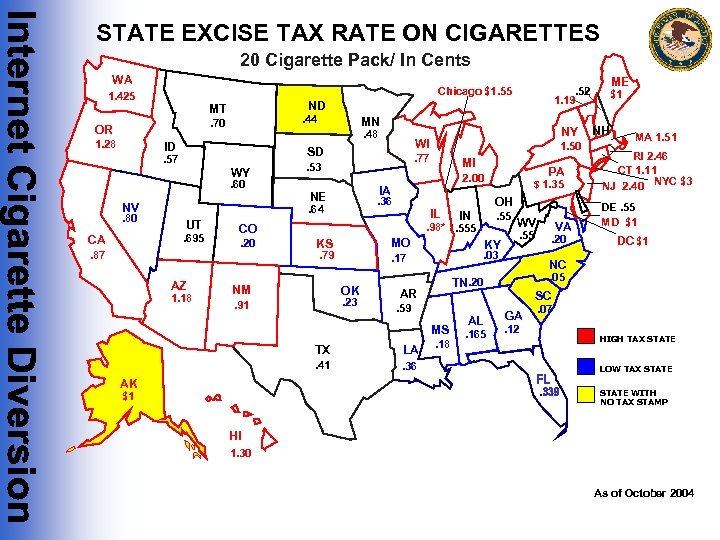 STATE EXCISE TAX RATE ON CIGARETTES 20 Cigarette Pack/ In Cents WA Chicago $1. 55 1. 425 . 44 . 70 OR 1. 28 WY . 60 NV UT . 87 AZ 1. 18 MI $ 1. 35 IA NE . 36 IL OH IN . 55 . 98*. 555 MO KS . 79 NM KY . 23 AR MS LA . 41 . 36 . 55 . 18 AL. 165 VA . 20 MA 1. 51 RI 2. 46 CT 1. 11 NYC $3 NJ 2. 40 DE. 55 MD $1 DC $1 NC. 05 TN. 20 . 59 TX WV . 03 . 17 OK . 91 AK PA 2. 00 CO. 20 1. 50 . 77 . 53 . 64. 695 CA WI SD . 57 $1 VT NY NH MN. 48 ID . 80 1. 19 ND MT ME . 52 SC GA. 12 . 07 HIGH TAX STATE LOW TAX STATE WITH NO TAX STAMP $1 HI 1. 30 As of October 2004